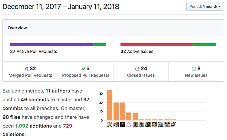 Section titled Open and welcoming dev teamThe Amber project is active. Development on the tools, framework, libraries, and documentation is constant. Yet I’ve felt welcomed into the fold as an Amber contributor as the core team readily reviews and merges my pull requests, discusses framework direction and goals, and openly accepts suggestions and contributions from casual contributors as well as frequent benefactors. This picture is from the Github Pulse and shows how active the project has been this month: